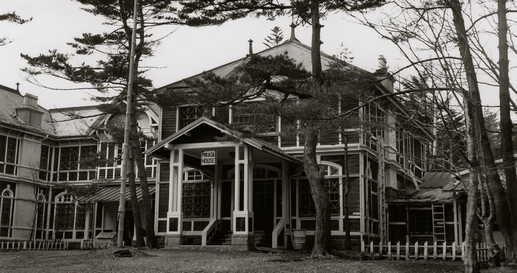 三笠ホテルの創業者は、日本郵船や明治製菓の重役を務めた実業家山本直良です。設計者はイギリスで設計を学んだ岡田時太郎、監督は万平ホテルの初代佐藤万平、棟梁は軽井沢の建築を多く手掛けた小林代造が務めています。