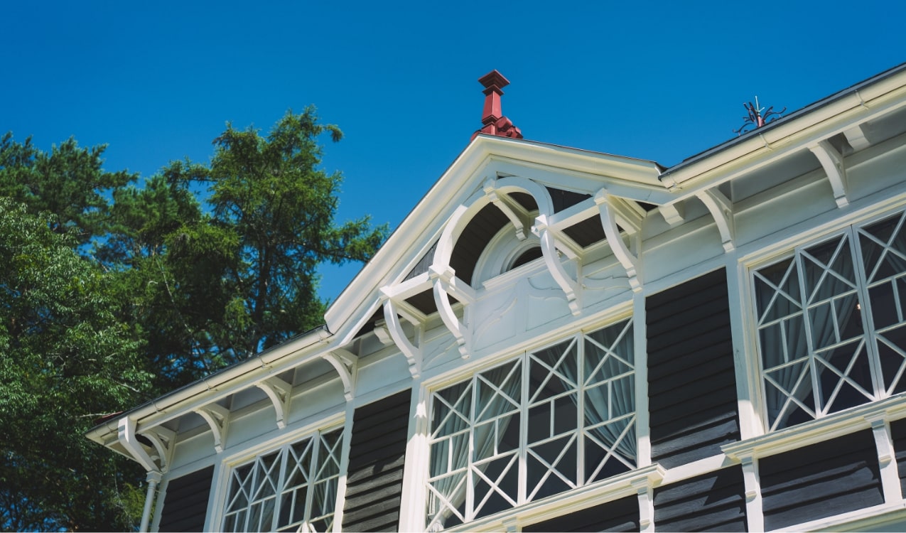 八角形の塔屋や軒を支える湾曲したブラケット、太縁の枠と幾何学模様のガラス窓等が外観の特徴で、内部は英国製タイルの水洗トイレやロビーのシャンデリア等、明治期における海外の優れたものや様式等を取り入れた様子が随所に伺えます。